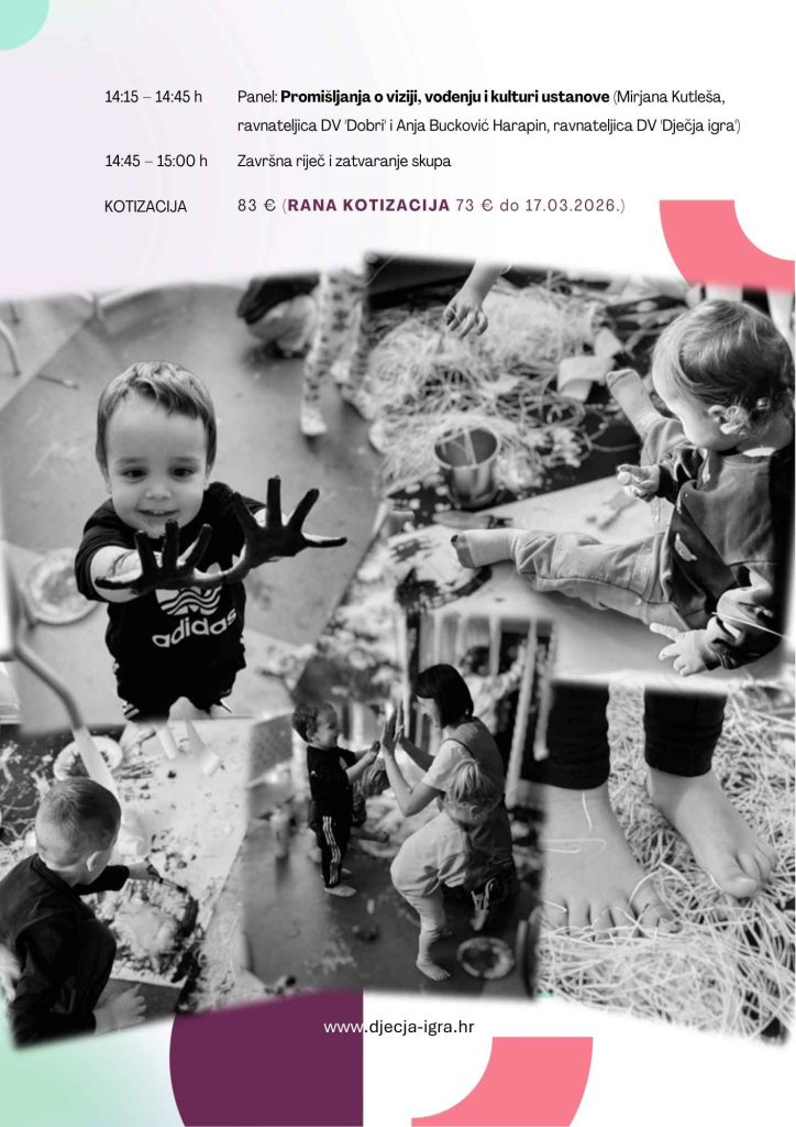 - 14:15 – 14:45 h Panel: Promišljanja o viziji, vođenju i kulturi ustanove (Mirjana Kutleša, ravnateljica DV ‘Dobri’ i Anja Bucković Harapin, ravnateljica DV ‘Dječja igra’)