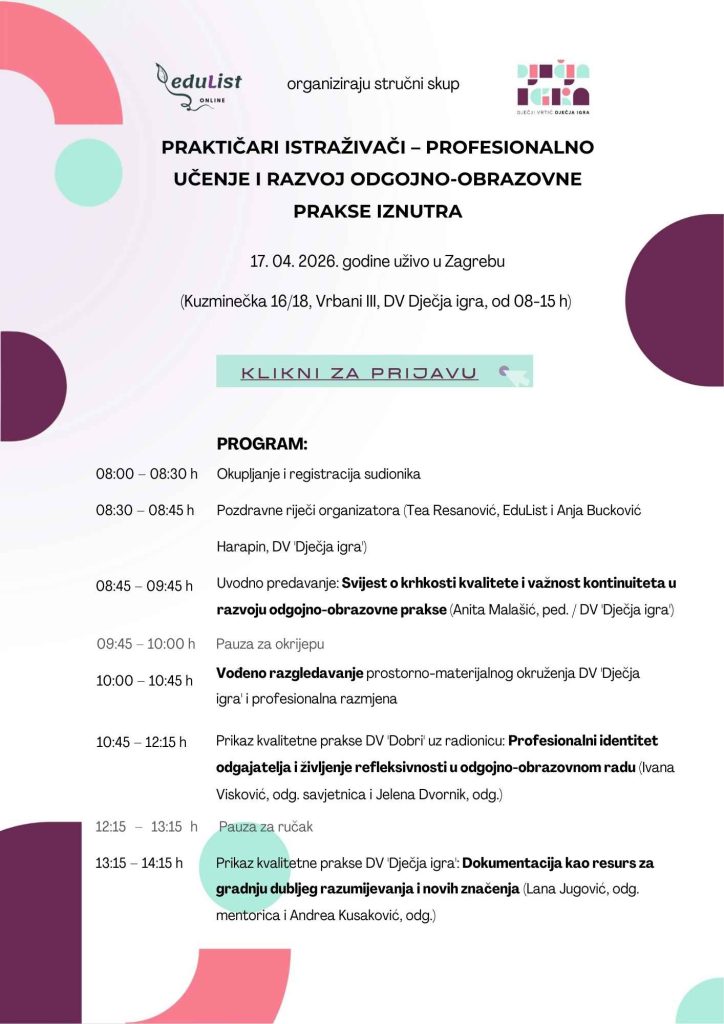 - 08:30 – 08:45 h Pozdravne riječi organizatora (Tea Resanović, EduList i Anja Bucković Harapin, DV ‘Dječja igra’)