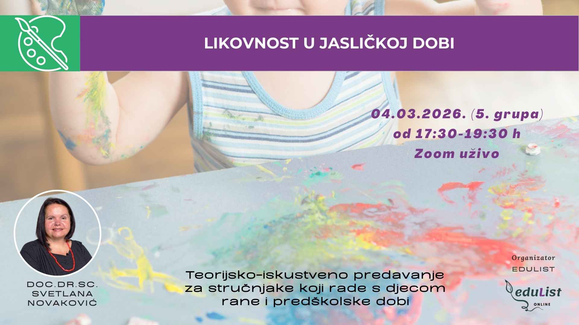 Likovnost u jaslicama važan je dio ranog razvoja djece, jer im omogućuje slobodno izražavanje kroz boje, oblike i materijale. Na ovoj online edukaciji naučit ćete kako poticati kreativnost djece jasličke